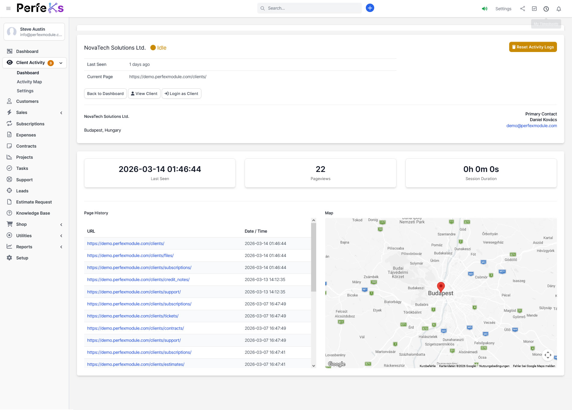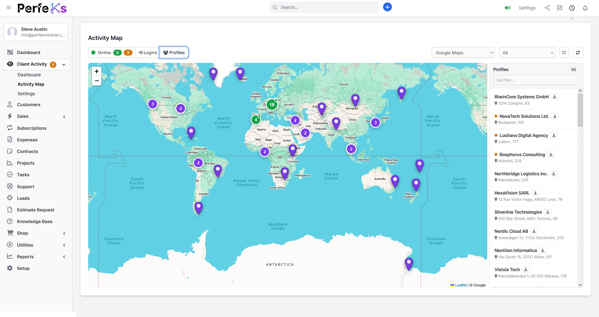 See how real-time monitoring, session analytics and global activity mapping work inside Perfex CRM.