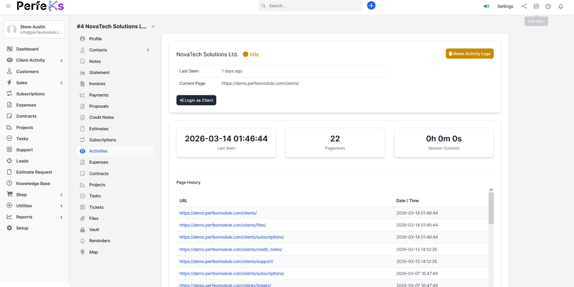 Track sessions, page activity, engagement and geographic usage directly inside Perfex CRM.