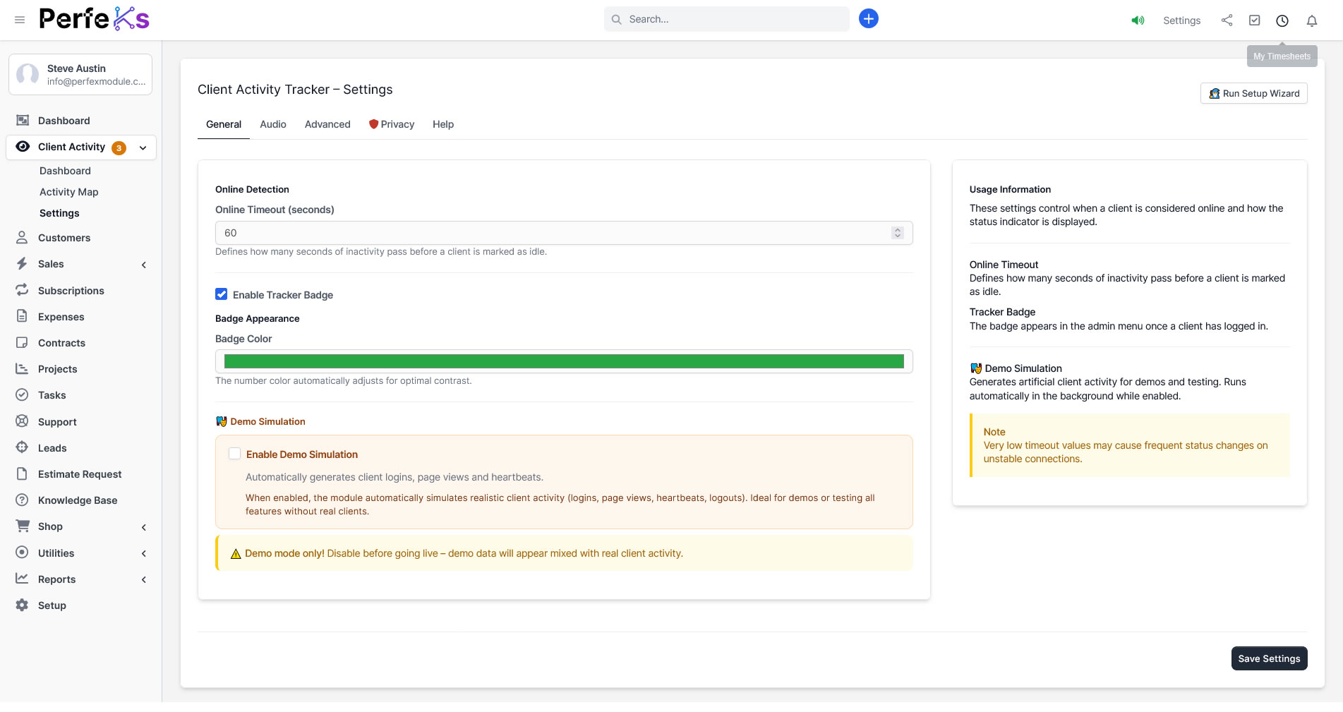 The Client Activity Tracker gives you full visibility into how clients interact with your portals, dashboards and services. Monitor sessions in real time, analyze engagement patterns, identify inactive users and optimize onboarding experiences — all from inside your existing Perfex environment. No integrations. No external dashboards. No data leaving your system.