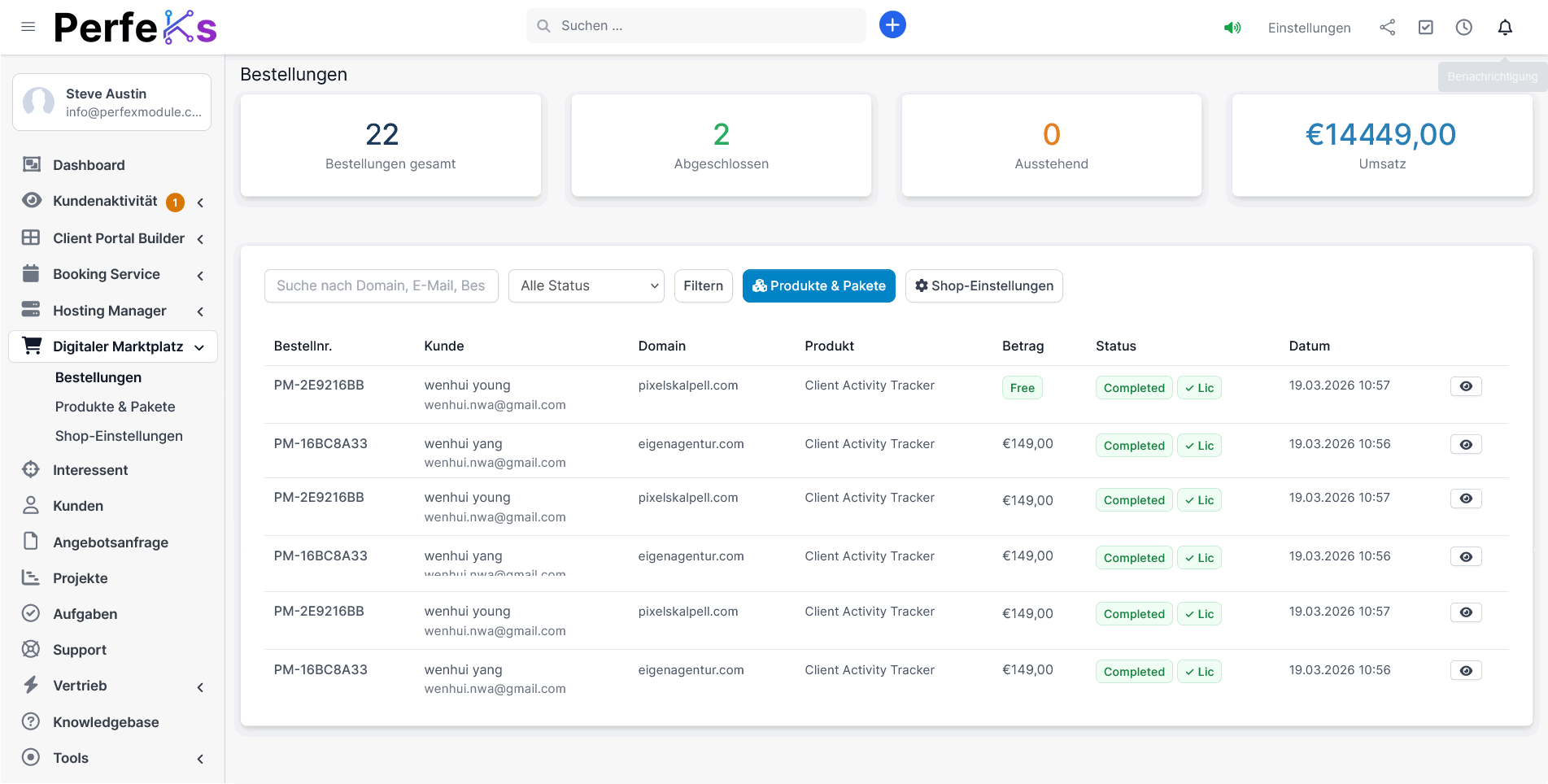 Verwandeln Sie Ihr CRM in ein vollständiges digitales Verkaufssystem. Erstellen Sie Produkte, verwalten Sie Preise und automatisieren Sie die Lizenzauslieferung — alles innerhalb von Perfex.